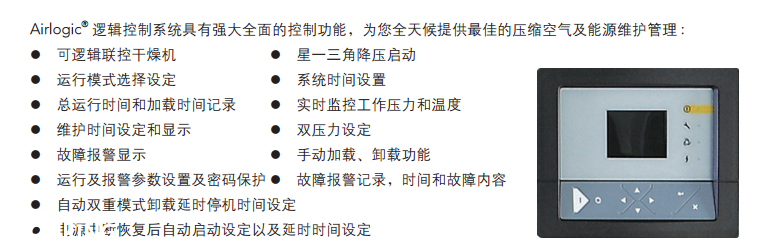 Airlogic®邏輯控制系統(tǒng) 昆西QGD/QGV系列標(biāo)配Airlogic®邏輯控制系統(tǒng)。無(wú)論在干燥或潮濕、炎熱或寒冷的環(huán)境中,是您可信賴的無(wú)故障運(yùn)行的控制平臺(tái)。中文真彩色液晶,界面友好,操作簡(jiǎn)便。 提供多種控制模式的選擇,提高供氣質(zhì)量,運(yùn)行可靠,效率更高?蓪(duì)壓縮機(jī)設(shè)定為本地控制模式、遠(yuǎn)程控制模式和網(wǎng)絡(luò)控制模式。本地控制模式下,壓縮機(jī)加載,如果壓力持續(xù)上升到卸載壓力,壓縮機(jī)進(jìn)入卸載狀態(tài)。在卸載狀態(tài),如果設(shè)定的時(shí)間內(nèi)沒有負(fù)荷需求,壓縮機(jī)會(huì)進(jìn)入待機(jī)狀態(tài),以節(jié)省能源。直到有新的負(fù)荷需求,壓縮機(jī)再次啟動(dòng)進(jìn)入加載狀態(tài)。在遠(yuǎn)程控制模式下,設(shè)備切換到遠(yuǎn)程進(jìn)行啟停。在網(wǎng)絡(luò)模式下,可實(shí)現(xiàn)多臺(tái)QGD/QGV壓縮機(jī)聯(lián)網(wǎng)運(yùn)行。每臺(tái)壓縮機(jī)根據(jù)負(fù)荷情況自動(dòng)進(jìn)行啟停,加卸載控制,相互配合以實(shí)時(shí)滿足負(fù)荷要求。每臺(tái)壓縮機(jī)按自身的網(wǎng)絡(luò)lD,順序地進(jìn)入或退出網(wǎng)絡(luò),退出即進(jìn)入停機(jī)狀態(tài)。 Airlogic®邏輯控制系統(tǒng)具有強(qiáng)大全面的控制功能,為您全天候提供優(yōu)秀的壓縮空氣及能源維護(hù)管理:
