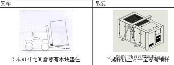 螺桿空壓機在安裝前需要放置在指定位置,在運輸放置過程中可以使用叉車或者吊裝的方式進(jìn)行運輸放置,但是需要注意操作方式需按下圖展示要求進(jìn)行。