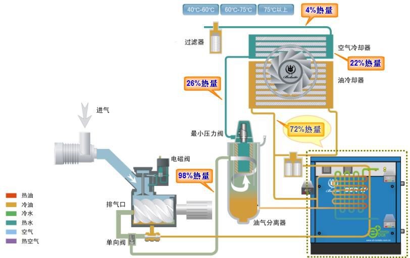 空壓機熱能回收機充分利用空壓機工作時的余熱,空壓機風(fēng)冷部分散熱風(fēng)機或散熱器(因油溫、氣溫降低在75~85℃合適的條件下)自動停用,同時可冷卻空壓機產(chǎn)生出來的氣體,減少了干燥機的工作負(fù)荷從而達(dá)到空壓機、干燥機省電、節(jié)能、環(huán)保、減排、降低磨損、延長壽命、安全可靠的目的。由于熱能轉(zhuǎn)換機和熱水輸送泵的功率或用電量<空壓機風(fēng)冷部分散熱風(fēng)機功率或用電量.,所以空壓機熱能轉(zhuǎn)換機能達(dá)到"0"成本運行.